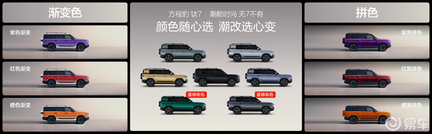 为了让广大用户选得尽兴,钛7直接一步到位,带来了7款外观颜色、3 款内饰颜色,同步在官方商城上架了6款潮改方案,可满足不同用户的审美偏好。