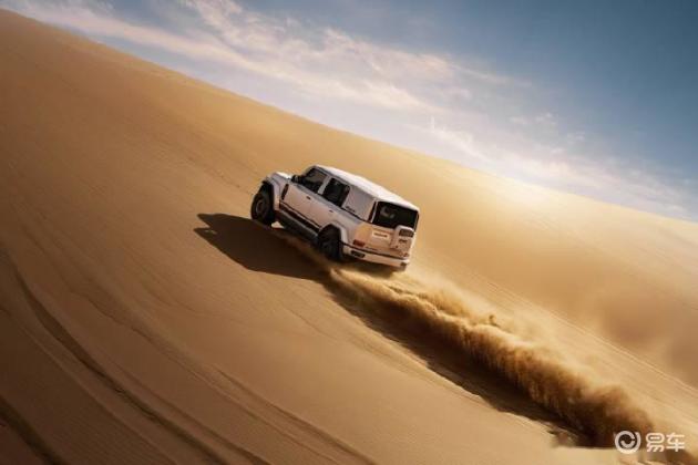整车设计实现了经典再造,方正的剪影沿袭了军品基因,但通过哑光车漆与流线冲压工艺焕发出未来质感。前脸的矩阵式呼吸灯组与参数化格栅形成数字碰撞,隐藏式充电接口与外置多功能拓展架在视觉整体性中暗藏玄机。C柱的悬浮设计延伸至车顶行李舱,形成极具辨识度的机甲体态,全车23处空气动力学优化在粗犷造型中维持着0.29Cd的低风阻系数。