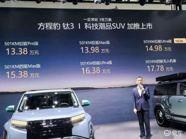 车展上,方程豹钛3新增501km后驱Ultra版,售价14.98万元。新车是后驱版本的高配车型,新增微光粉与冰晶蓝两款车漆,提供灵鸢·比亚迪智能车载无人机系统可选装。