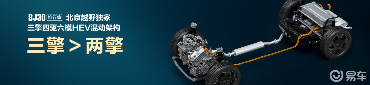 三擎混动,节能宗师!BJ30旅行家要做最省的轻越野旅行SUV,采用北京越野独家研发的“三擎四驱六模HEV混动架构”,百公里综合油耗低至5.85L,具备纯电、串联、并联、直驱、能量回收、驻车充电六大动力模式,系统会根据车速、路况、油门深度等参数,在各种模式间智能切换;搭载混动专用发动机,是保时捷同款黑科技,热效率高达41%。