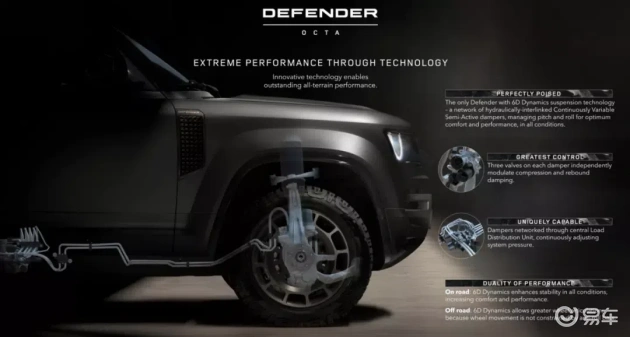 除了动力,这次的底盘也很有说法。OCTA 也采用了揽胜SV那套双腔三阀空悬的 6D 动态悬架系统。