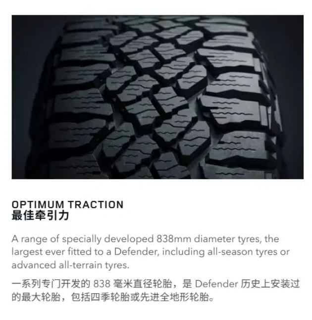 275mm 的胎宽,60 的扁平比,以及高达 838 mm 的轮胎直径和更深的花纹,专为软泥、湿草和恶劣的岩石地形而生。路虎称其为“卫士装备过的最厚实的轮胎”。