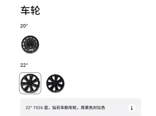 轮毂方面则有 20 寸的拉力风格的锻造轮毂,和 22 寸的铝合金轮毂可以选择。