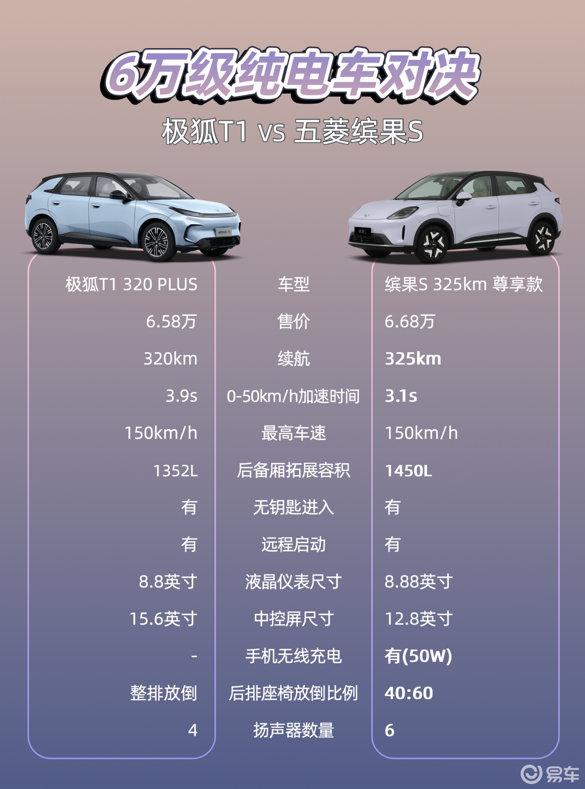 6万多的价格,基本上你可以考虑极狐T1的320 PLUS版本,指导价6.58万;缤果S则是可以考虑325km尊享款,指导价6.68万,置换补贴后6.38万。总之差价也就一两千块钱,那么产品力上它们又有啥不同呢?
