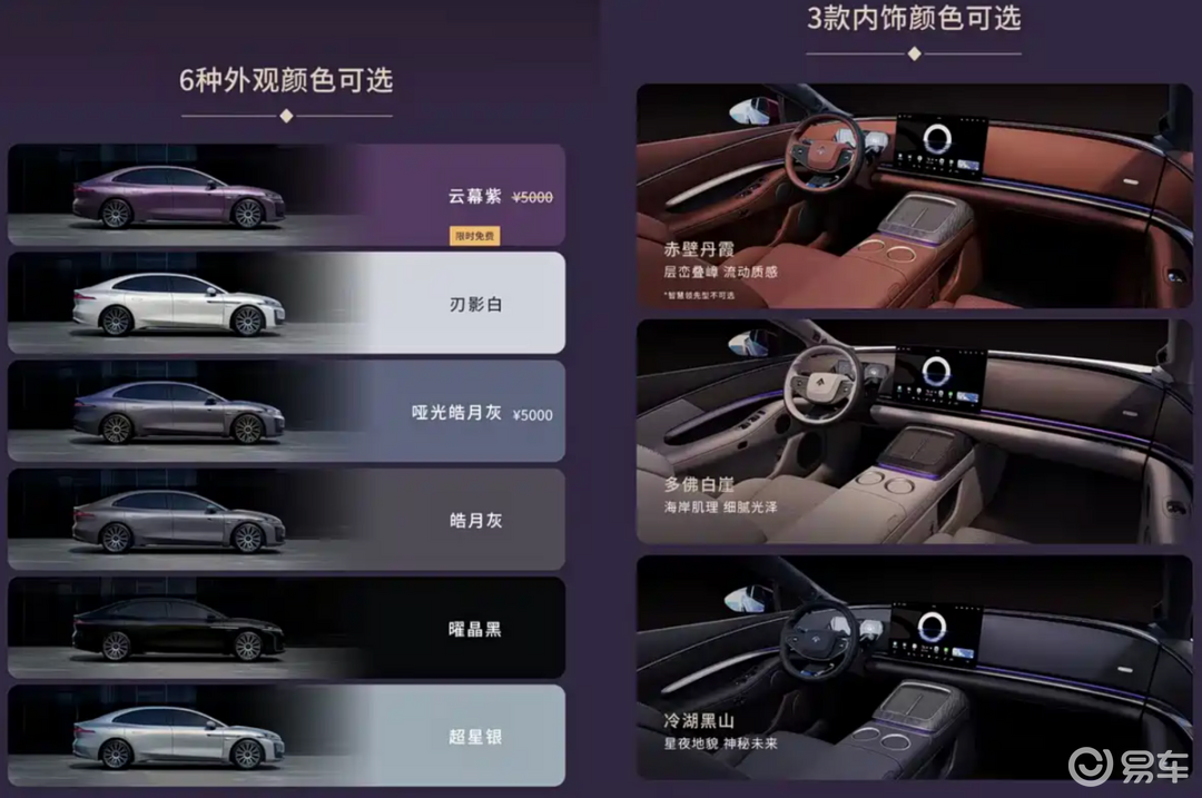 6种外观车漆可选,包含云暮紫、刃影白、哑光皓月灰、皓月灰、曜晶黑、超星银。