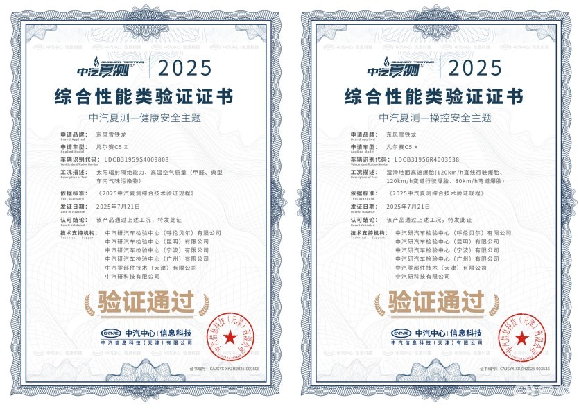 2025 年 7 月,在中汽夏测中通过太阳辐射隔绝、高温空气质量、湿滑路面高速爆胎三大测试,荣获健康与操控双安全认证;2025 年 12 月,在中汽中心极寒驾控安全测试中,以 140km/h 时速完成压实雪面前轮爆胎测试,更在 20% 坡度冰雪路面满载一次登顶,获颁 “操控稳定性挑战” 认证证书。一项项硬核成绩,印证了凡尔赛 C5 X 经得起推敲的产品品质,为用户的每一次出行保驾护航。