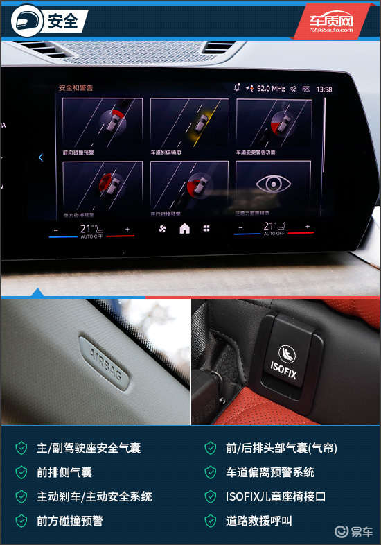 安全配置方面,评测车搭载了丰富的主/被动安全配置。例如前/后排头部气囊(气帘)、前排侧气囊、车道偏离预警系统、主动刹车/主动安全系统、前方碰撞预警等主/被动安全配置在评测车上均有配备,可以有效提升行车安全性。