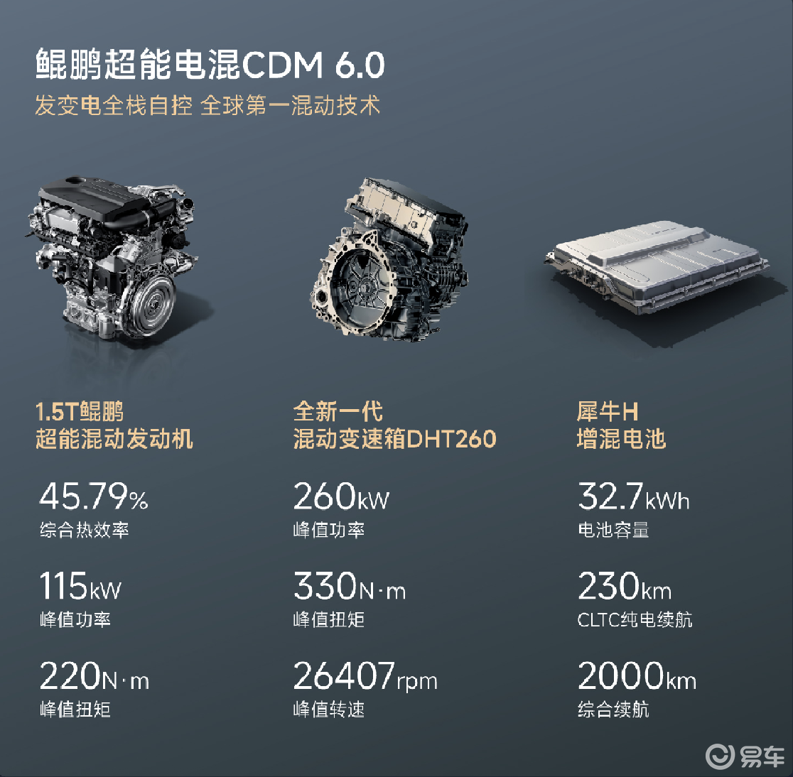 动力、油耗和续航,一直以来都是家用SUV的矛盾点所在,总是出现“鱼与熊掌不可兼得”的失衡局面。但风云T9L搭载鲲鹏超能电混CDM 6.0系统无痛解决这一问题,1.5T混动专用发动机可实现45.79%行业领先的热效率,配合DHT260混动变速箱,馈电油耗低至3.9L/100km,市区通勤一公里不到一毛钱,养车成本直接减半。
