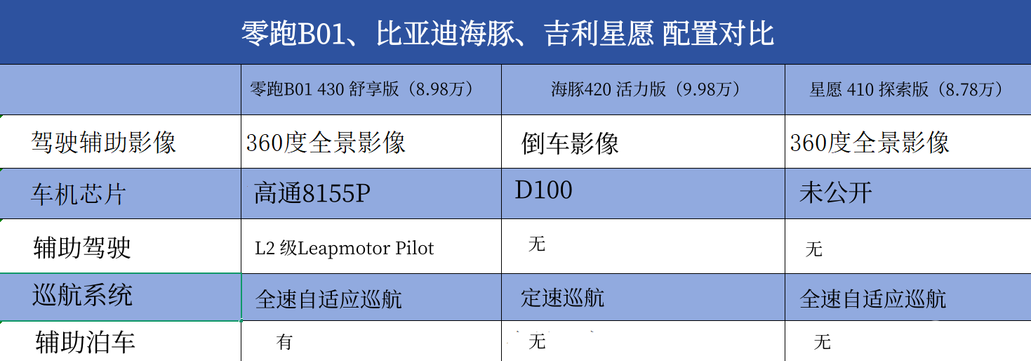 智能配置方面。我们选取了价格相近的三款车型进行简单的对比,分别是零跑B01 430舒享版(指导价 8.98万元)、比亚迪海豚 420 活力版(指导价9.98万元)、吉利星愿410探索版(指导价8.78万元)。其中零跑B01入门就标配8155芯片,360度全景影像、双语音AI大模型,L2级辅助驾驶、辅助泊车等,这可是星愿和海豚都没有的配置。要是预算再往上提,B01还能上激光雷达,开起来又智能又省心。
