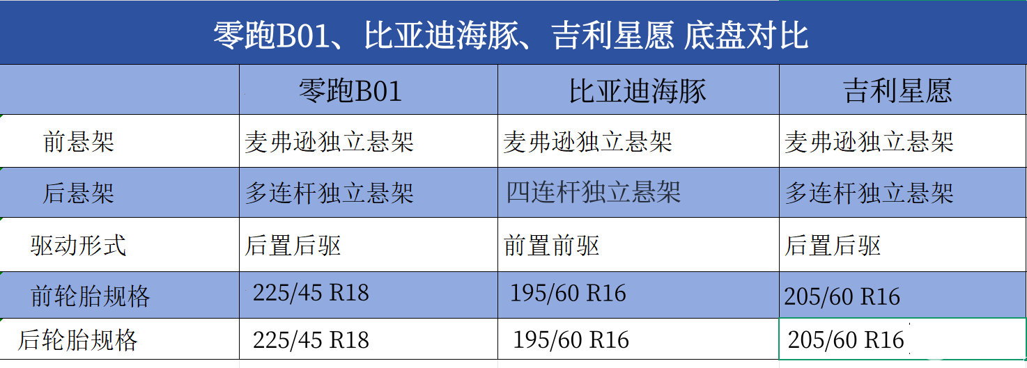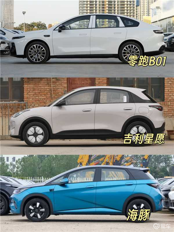另外,底盘结构也会直接影响车辆的舒适性。零跑B01和吉利星愿使用的都是前麦弗逊、后多连杆独立悬架,只有海豚使用的是前麦弗逊、后四连杆独立悬架。另外,零跑B01轮胎是225/45 R18、星愿是205/60 R16、海豚是195/60 R16。所以从简单的底盘数据上来看,零跑B01在行驶中的稳定性更好、高速颠簸感更轻微,驾驶也更平稳。星愿可以排在第二,海豚要排在第三。