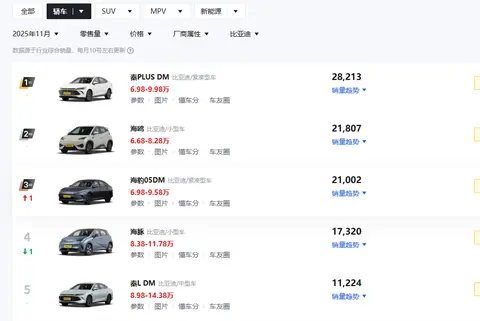 秦PLUS DM-i、秦L DM是两款非常热销的车型,根据筛选车讯2025年11月销量榜,秦PLUS DM为比亚迪销量最高的车型为28213辆,秦L DM的销量为11224辆。