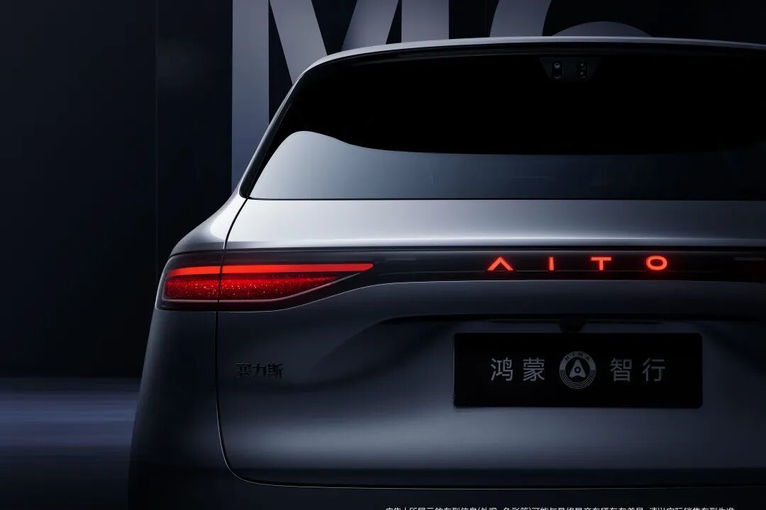 车尾设计与前脸相呼应,尾灯造型锋利,内部发光的AITO标识提升了夜间辨识度。黑色运动包围与前脸前唇形成呼应,搭配隐藏式排气设计,兼顾了运动感和精致感。