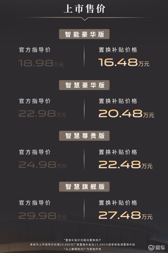 昊铂A800共推出4个配置版本,全系可享最高25000元综合置换补贴(10000元品牌置换补贴+15000元新能源车国家置换补贴),具体版本及价格如下: