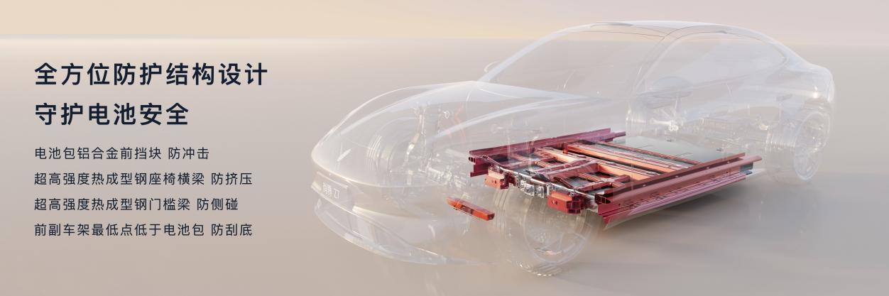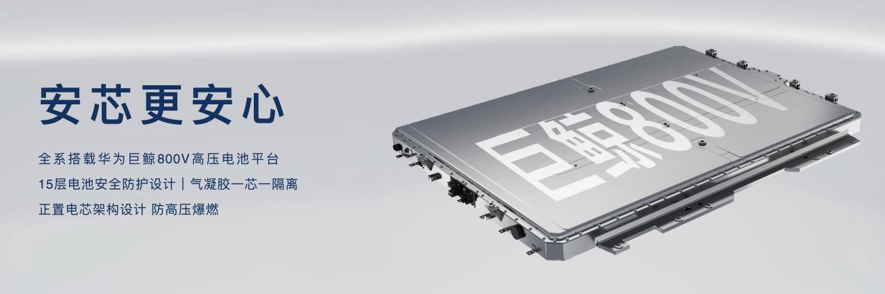 电池搭载华为巨鲸800V高压平台,具备15层安全防护与气凝胶隔离结构,配合防冲击、防挤压、防侧碰、防刮底结构设计,实现全维度电池安全保障。