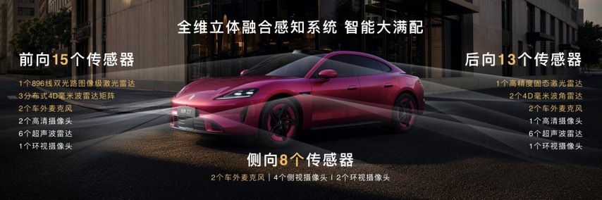 智能驾驶硬件实现全系高配,全车搭载36个高精度传感器,包括896线双光路图像级激光雷达、固态激光雷达、4D毫米波雷达矩阵等,支持全维防碰撞4.0与eAES 2.0自动紧急转向功能,可实现高速与城区高阶辅助驾驶。泊车系统支持极窄车位、断头路车位等复杂场景自动泊车。