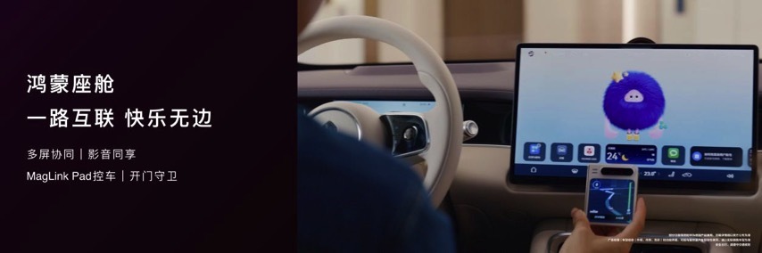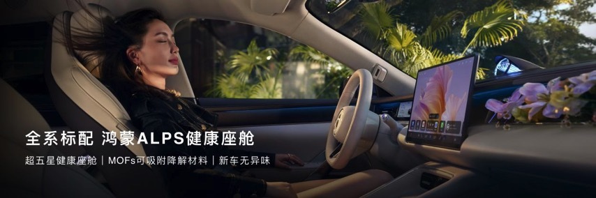 座舱以实用与舒适为导向,标配W-HUD、流媒体后视镜与交互随动屏,副驾设有专属储物空间。车内搭载鸿蒙智能座舱,支持多屏协同、MagLink平板控车等功能。健康配置方面,全系标配鸿蒙ALPS健康座舱,搭载MOFs吸附降解材料与水离子空调系统,降低车内异味并提升驾乘舒适度。